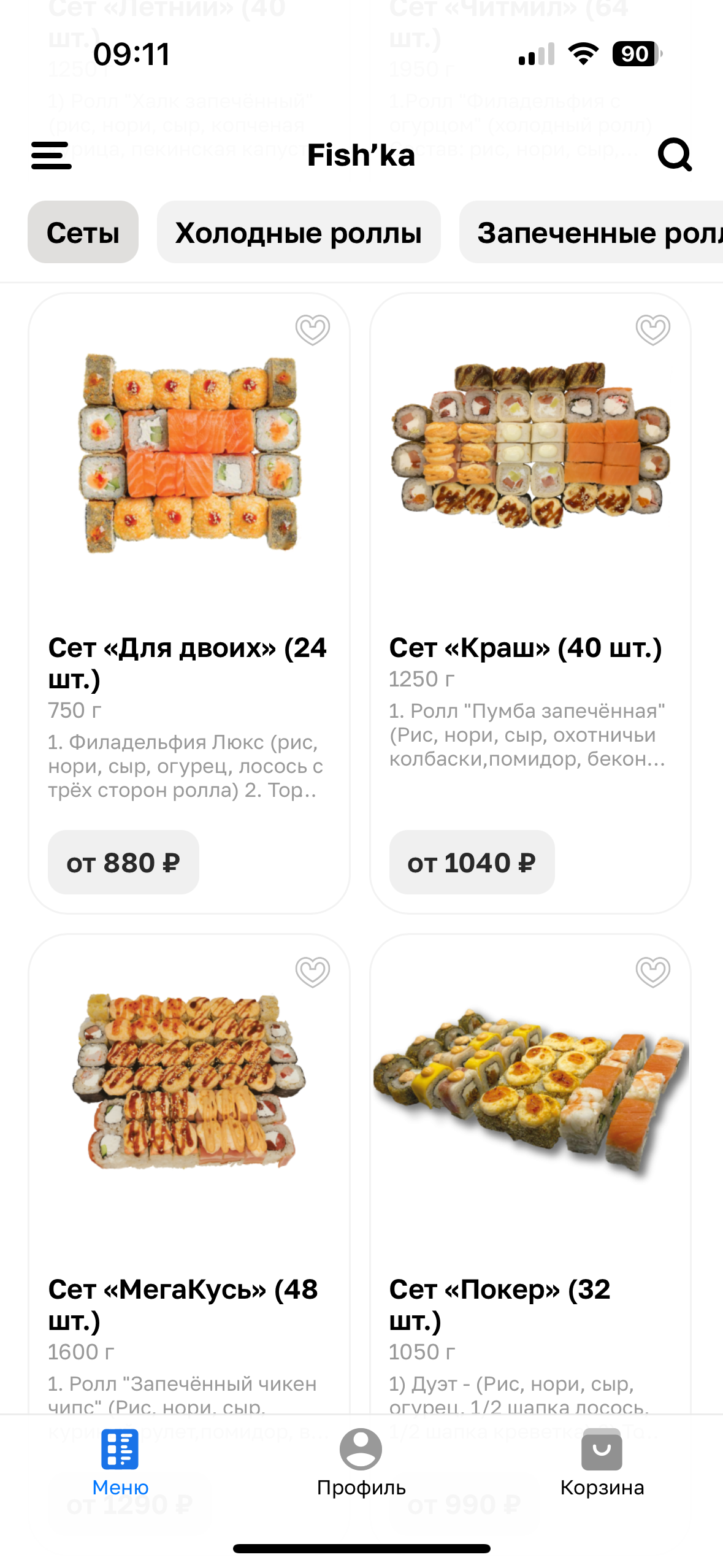 1. Ролл "Тайская креветка" (Рис, нори, сыр, креветка темпура, ананас, соус для запекания, соус свит чили); 2. Ролл "Филадельфия запечённая с огурцом" (Рис, нори, сыр, огурец, лосось, соус для запекания, соус унаги, кунжут); 3. Ролл "Чикен чипс запечённый" (Рис, нори, сыр, куриный рулет,помидор, в чипсах, соус для запекания,соус свит чили); 4. Ролл "Снежный барс," (Рис, нори, сыр, краб, помидор, кужнут, соус для запекания, соус унаги); 5. Ролл "Филадельфия с креветкой" (Рис, нори, сыр, креветки, лосось); 6. Ролл "Лава" (Рис, нори, креветка темпура, сырная шапочка); 7) Ролл "Пумба" (Рис, нори , сыр, охотничьи колбаски,помидор, бекон, соус спайси); 8) Ролл "Чесночная креветка" (Рис, нори, сыр, креветка, панировка, чесночный соус); 9) Ролл "Тори фурай" (Рис, нори, сыр, куриный рулет, пекинская капуста, панировка, соус свит чили); 10) Ролл "Калифорния темпура" (Рис, нори, сыр, масаго, краб, огурец, панировка, соус унаги).