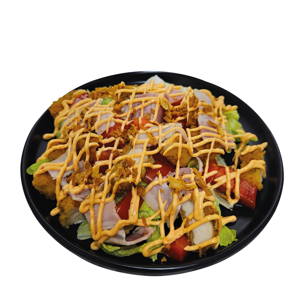 салат айсберг, томаты, куриные стрипсы, бекон, лук фри, соус спайси