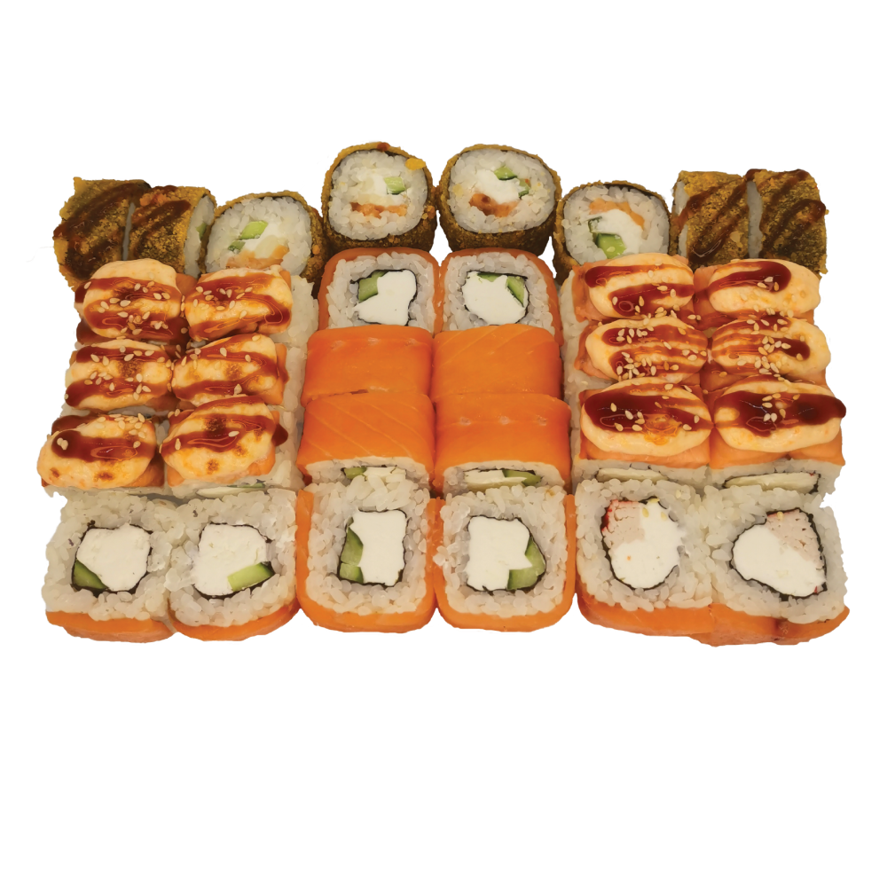 1. Ролл "Филадельфия Люкс" (Рис, нори, сыр, огурец, лосось (с трёх сторон ролла))